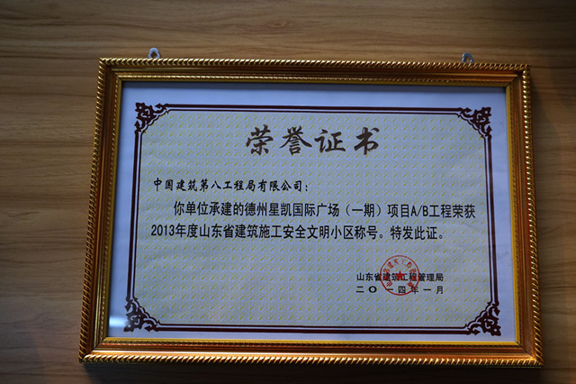 德州星凱國際廣場項(xiàng)目榮獲“山東省建筑施工安全文明小區(qū)”稱號(hào)
