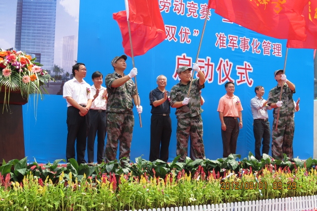 “發(fā)揚(yáng)鐵軍精神,頑強(qiáng)拼搏,奮勇?tīng)?zhēng)先,精細(xì)管理,精心施工,打造精品工程?!毙x誓詞的聲音鏗鏘有力,員工的干勁激情似火。8月1日“建軍節(jié)”這天,創(chuàng)維半導(dǎo)體設(shè)計(jì)大廈項(xiàng)目隆重舉行勞動(dòng)競(jìng)賽、“三號(hào)聯(lián)創(chuàng)”、創(chuàng)“雙優(yōu)”暨準(zhǔn)軍事化管理活動(dòng)啟動(dòng)儀式。創(chuàng)維半導(dǎo)體設(shè)計(jì)大廈項(xiàng)目總經(jīng)理林力,深圳市建控地盤(pán)監(jiān)理有限公司副總經(jīng)理王玉祥、項(xiàng)目總監(jiān)楊躍明,總公司駐廣東辦事處黨工委副書(shū)記閔國(guó)安,局駐廣州辦事處副主任楊深奎及公司工會(huì)主席等領(lǐng)導(dǎo)及項(xiàng)目部全體員工、各分包隊(duì)伍共 120余人參加了活動(dòng)。