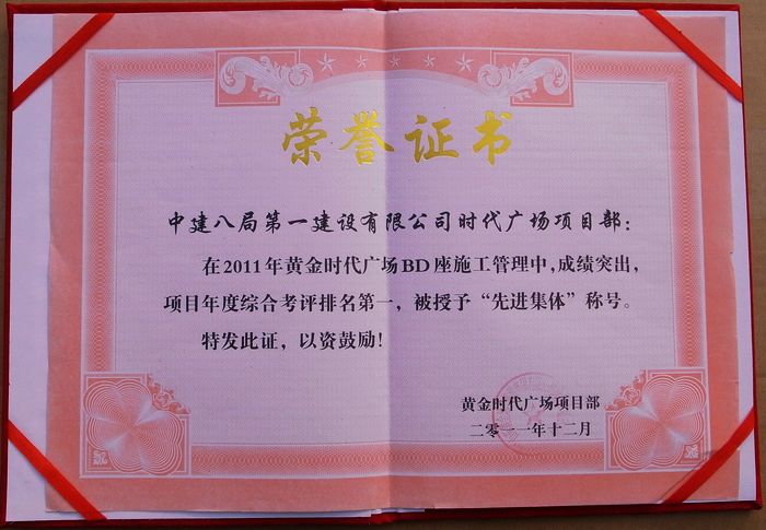 據(jù)悉,黃金時(shí)代廣場(chǎng)項(xiàng)目經(jīng)理部積極響應(yīng)局號(hào)召,深入落實(shí)準(zhǔn)軍事化管理相關(guān)精神,以精細(xì)管理為主線,加強(qiáng)技術(shù)質(zhì)量管理,加大開源節(jié)流力度,在質(zhì)量、工期、安全等各個(gè)方面取得了較好的成績(jī)。先后榮獲局“準(zhǔn)軍事化管理示范項(xiàng)目”、“山東省安全文明示范工地”、“國(guó)家AAA級(jí)安全文明誠(chéng)信工地”及“總公司2010年度CI創(chuàng)優(yōu)金獎(jiǎng)”等榮譽(yù)稱號(hào)。