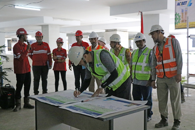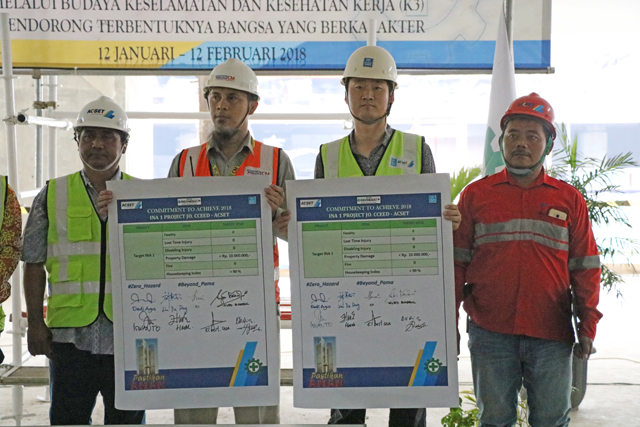早上七時三十分,活動正式開始,主持人致辭并宣讀了本年度安全生產(chǎn)月活動主題及啟動儀式的主要流程。活動儀式上,總監(jiān)理工程師Dedi宣讀了印尼勞工部關(guān)于建筑行業(yè)安全生產(chǎn)的相關(guān)法律和法規(guī),安全部經(jīng)理Iswanto就2017年項目安全生產(chǎn)活動進行總結(jié)報告,詳細(xì)回顧了過去一年里項目在安全管理方面取得的一系列成績,并就2018年安全管理目標(biāo)進行了展望。活動還對項目2018年度安全生產(chǎn)活動進行了詳細(xì)部署,項目經(jīng)理劉嘉東等主要管理人員簽訂了目標(biāo)責(zé)任狀。