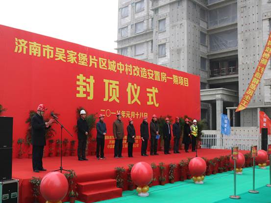 2018年1月18日上午10時17分,公司濟南市吳家堡片區(qū)城中村改造安置房一期項目主體結(jié)構(gòu)喜封金頂。濟南市城市建設(shè)集團有限公司副總經(jīng)理許為民,濟南國際醫(yī)學科學中心槐蔭區(qū)重點項目指揮部副總指揮高志偉,濟南市槐蔭區(qū)吳家堡街道辦事處主任孫莉,濟南市槐蔭區(qū)吳家堡街道辦事處副書記趙勇,山東營特建設(shè)項目管理有限公司總經(jīng)理徐友全,山東泰山工程項目管理有限公司總經(jīng)理喬涵,山東天宇工程項目咨詢有限公司總經(jīng)理孫春利,公司副總經(jīng)理?;瘧椀阮I(lǐng)導出席,施工單位、監(jiān)理單位及施工隊伍代表共同參加了封頂儀式。