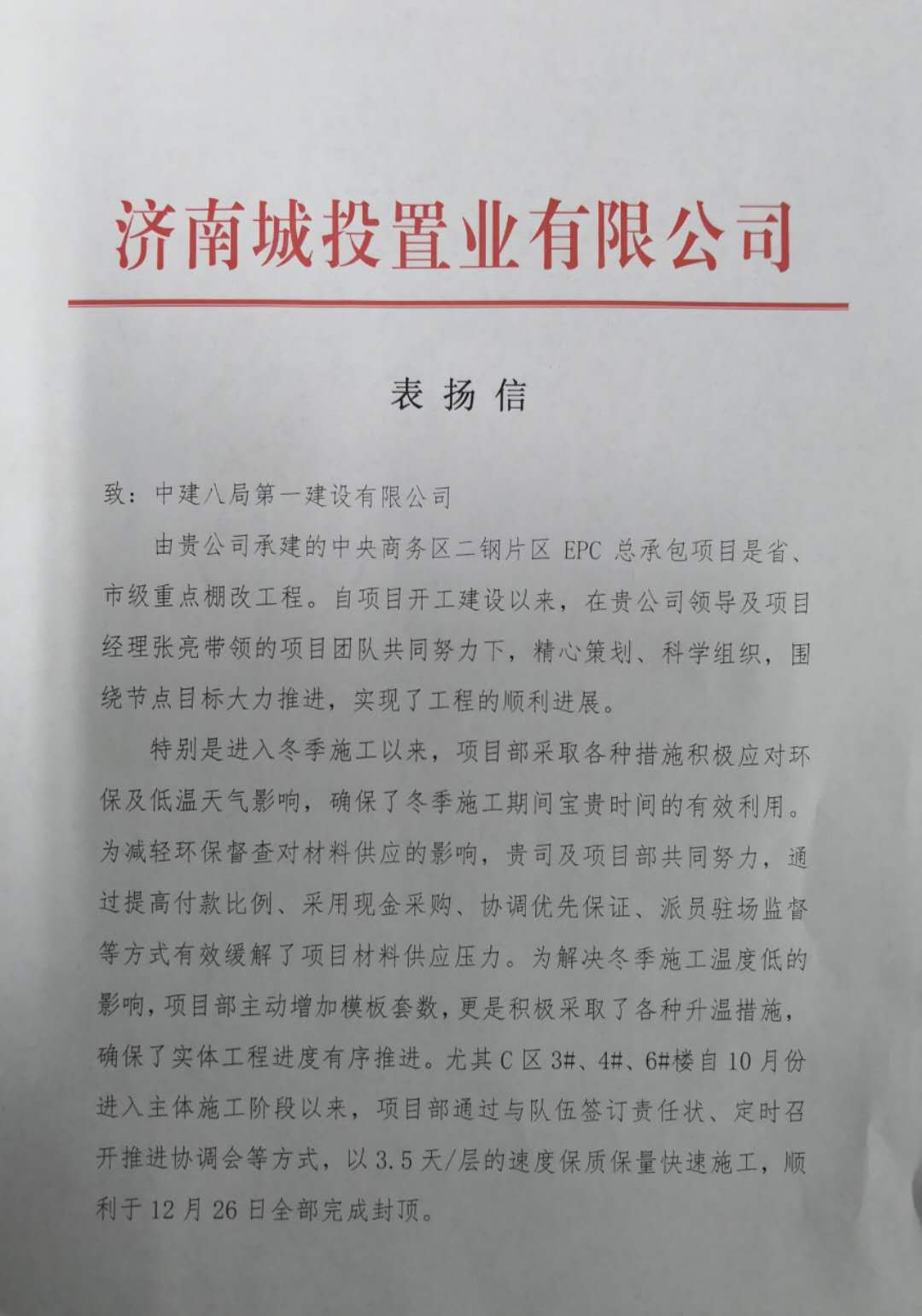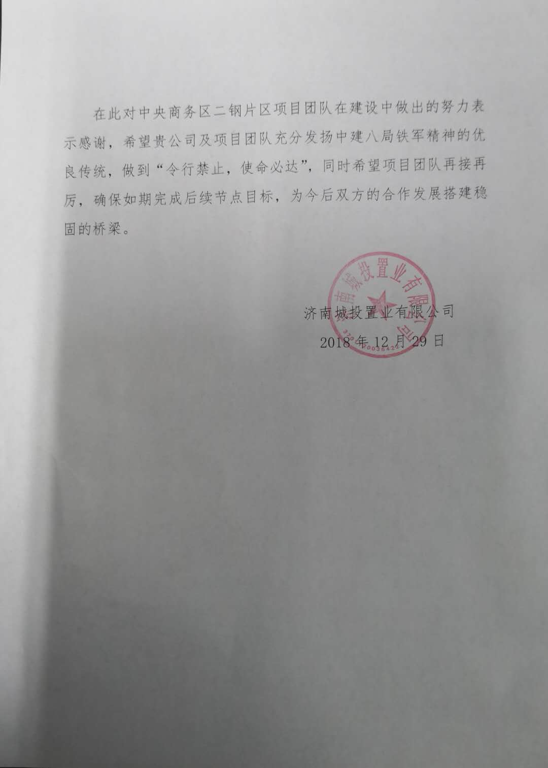 1月5日上午,中央商務區(qū)安置區(qū)項目收到濟南城投置業(yè)有限公司的表揚信。
