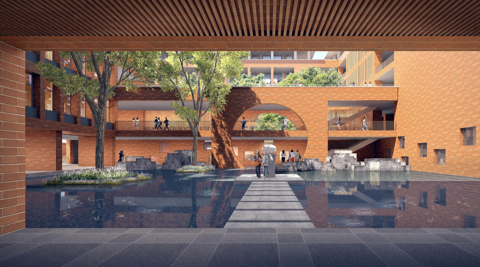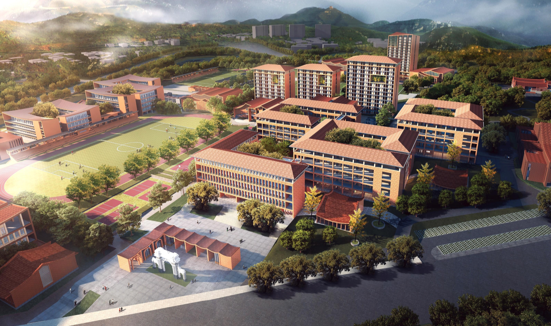 文教園二期用地位于一期用地的北側(cè),包括一棟培訓中心、室內(nèi)運動館、運動場、食堂三棟高層學生宿舍樓,培訓中心、禮堂及教師公寓,園區(qū)規(guī)劃整體上采用院落式布局。不同建筑依據(jù)功能、體量依山就勢,布置在不同的山地平臺,利用山地步道、綠坡、空中連廊等元素將建筑進行串聯(lián),形成極具山地建筑特色的園區(qū)景觀,實現(xiàn)與環(huán)境和諧共存。(呂良)