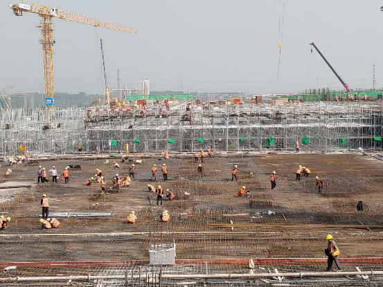 主廠房整個基礎總占地面積15.5萬平方米,自3月5日正式開始基礎階段施工以來,歷時25天,完成了21.5萬方的土方開挖。歷時15天,完成了19萬平方的防水卷材施工。歷時39天,完成了30多萬方混凝土的澆筑。