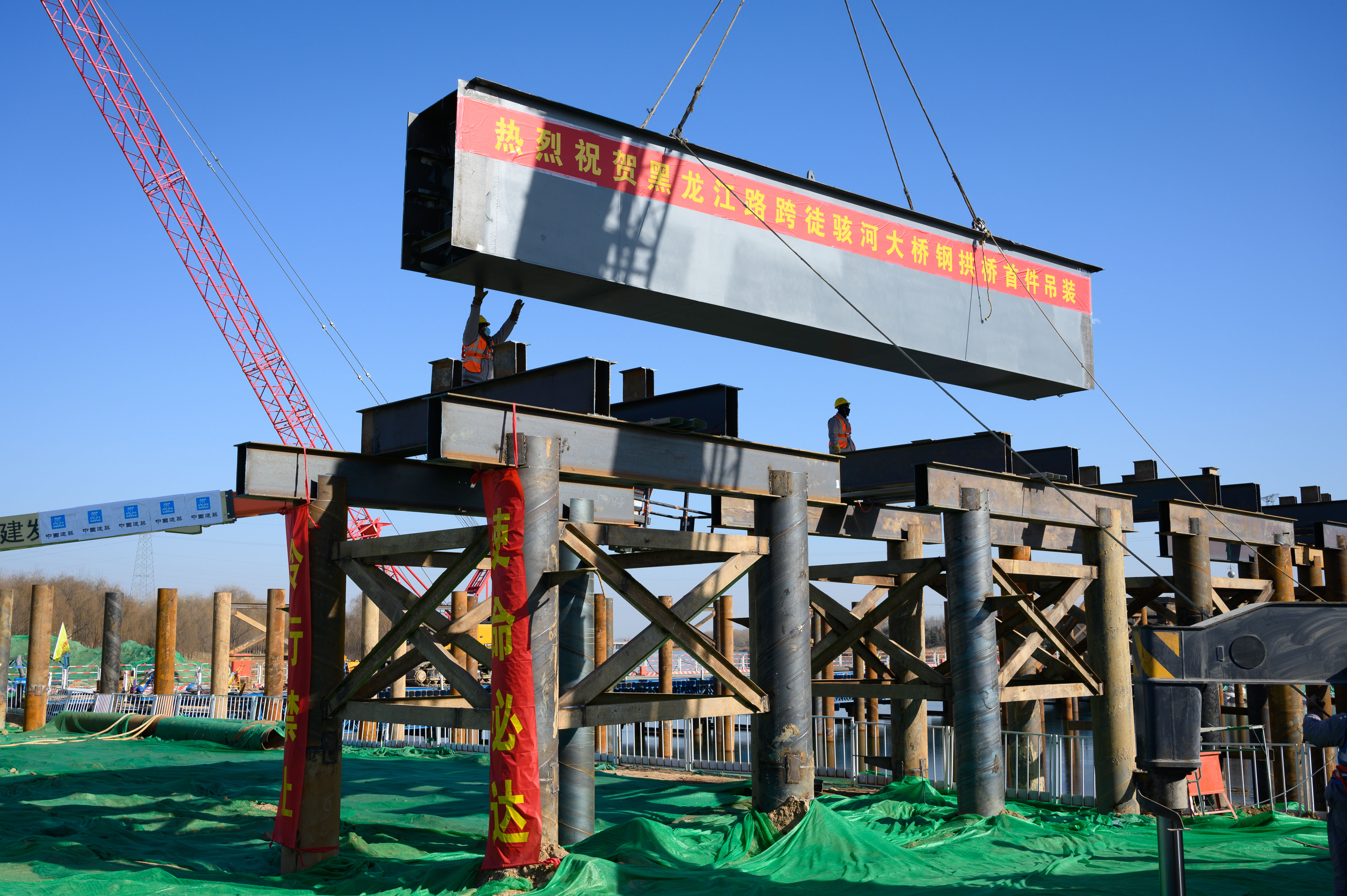 聊城市跨徒駭河大橋在-19℃嚴寒中進行首次鋼結(jié)構(gòu)主縱梁桿件吊裝