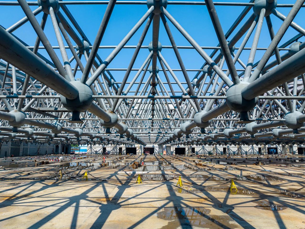 本次會(huì)展中心鋼網(wǎng)架采用正放四角錐焊接球網(wǎng)架通過(guò)46件球型支座支承于混凝土結(jié)構(gòu),涉及24種,共計(jì)1045個(gè)焊接球,桿件數(shù)量達(dá)到6000余件,鋼網(wǎng)架面積約為1萬(wàn)平方米,相當(dāng)于23個(gè)標(biāo)準(zhǔn)籃球場(chǎng)大小,提升重量達(dá)2150噸,相當(dāng)于把430頭成年大象提升13.35米。
