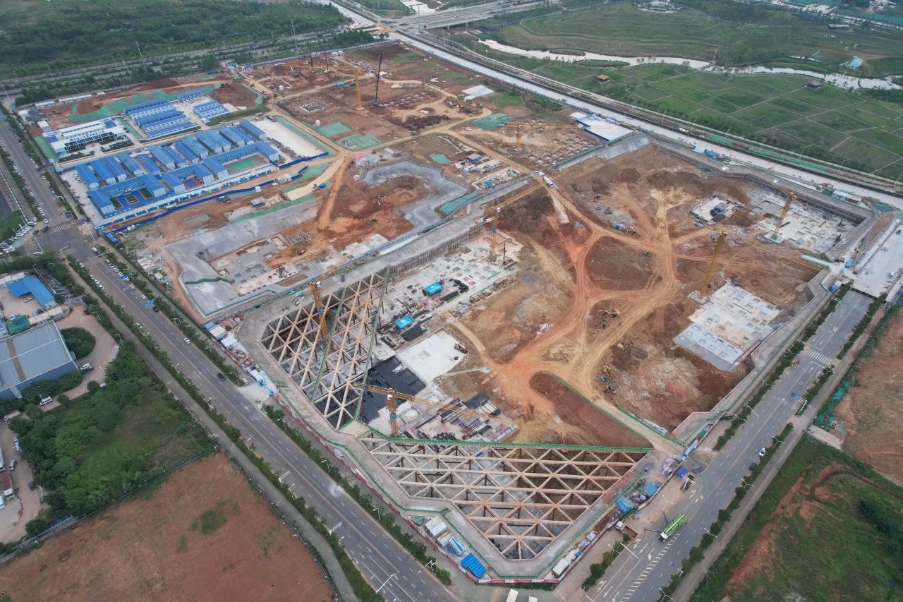 項(xiàng)目施工面臨“大、高、多”等困難,其中,地下室深基坑局部三層,接近總建筑面積的50%,高支模最高14.4米,且超危大工程高支模區(qū)域達(dá)28處。項(xiàng)目精心組織施工,科學(xué)安排生產(chǎn),采取平行施工的方式,克服基坑階段場(chǎng)區(qū)道路狹窄等困難,完成約70萬m3土方開挖和模板支護(hù)、拆撐。