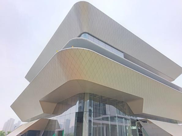 項(xiàng)目綜合樓外立面為“山峰”造型設(shè)計(jì),包含豎明橫隱玻璃幕墻、全玻幕墻、開縫鋁板幕墻、玻璃欄板4種幕墻系統(tǒng),采用5系進(jìn)口陽(yáng)極氧化鋁板,涂層厚度超15μm,具有極強(qiáng)耐腐蝕性,鋁板超20年不褪色;外立面菱形蜂窩板塊合計(jì)10228塊,四個(gè)轉(zhuǎn)角為雙曲蜂窩板,雙曲作業(yè)面超30%,以直線型、出挑、倒圓角等設(shè)計(jì)手法,塑造動(dòng)感、理性、簡(jiǎn)約的建筑造型。