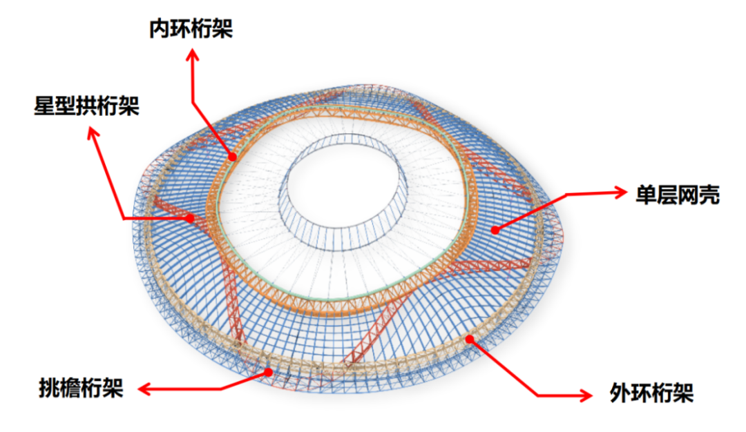 項(xiàng)目屋蓋結(jié)構(gòu)由鋼結(jié)構(gòu)、索膜結(jié)構(gòu)和金屬屋面組成,鋼結(jié)構(gòu)由內(nèi)、外環(huán)桁架、星型拱桁架挑檐桁架等88榀桁架以及單層網(wǎng)殼組成,單榀鋼桁架重約200噸,需要在60米高空完成拼裝焊接,外輪廓平面近似直徑280米的正圓,中心開口平面為長(zhǎng)軸176.5米、短軸156.5米的橢圓。
