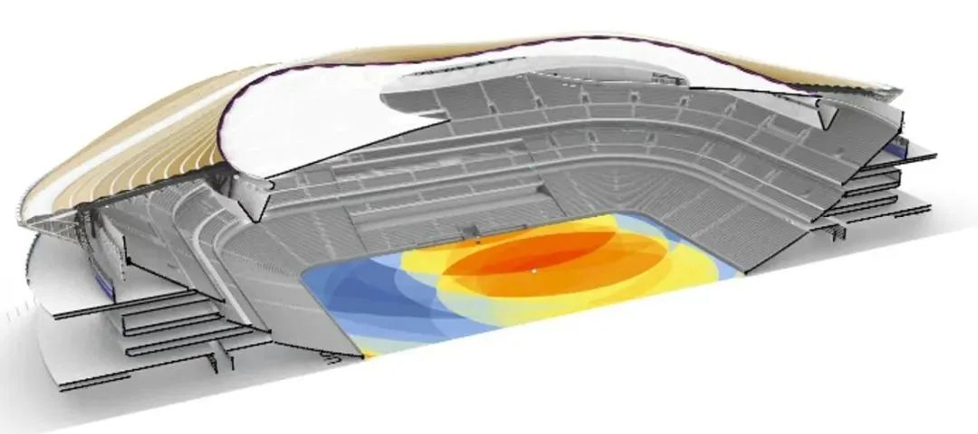 屋蓋鋼結(jié)構(gòu)內(nèi)側(cè)的索、膜結(jié)構(gòu)由CFRP-鋼索組合索桁架和大面積單層PTFE覆膜構(gòu)成,是國(guó)內(nèi)首例在專業(yè)足球場(chǎng)大規(guī)模應(yīng)用高透光率PTFE網(wǎng)格膜材料,創(chuàng)新融合了大懸挑屋蓋剛性體系異性索膜柔性體系等諸多大跨空間結(jié)構(gòu)元素,是目前國(guó)內(nèi)施工最為復(fù)雜的專業(yè)足球場(chǎng)之一,在兼顧功能、美觀與采光性能的同時(shí),具有“剛?cè)岵?jì)”結(jié)構(gòu)受力特征。