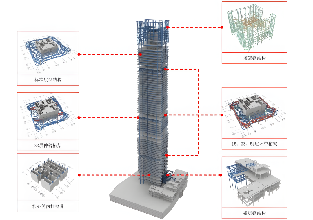項目鋼結構設計涵蓋伸臂桁架、環(huán)帶桁架超高塔冠等多種復雜鋼結構,總用鋼量達2萬余噸,核心筒采用了超高層建筑中罕見的自下而上單向縮失(逐漸縮?。w系,非對稱性核心筒結構呈現(xiàn)偏心狀態(tài),對核心筒垂直度控制難度大,項目在全生命周期應用BIM技術,利用三維掃描儀掃描核心筒數(shù)據(jù),提高鋼結構安裝一次成優(yōu)率,節(jié)省工期90余天。