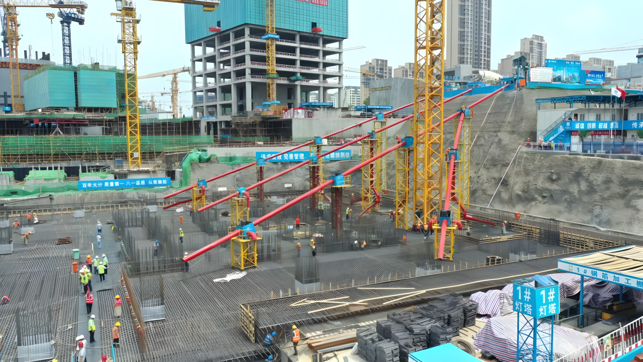 項目基礎筏板最大厚度7.7米,筏板混凝土總方量超1萬立方米,項目創(chuàng)新研發(fā)“全過程無間歇溜管法澆筑技術”,120輛攪拌車不間斷作業(yè)14小時,完成1萬立方米混凝土澆筑,刷新當時山東省混凝土澆筑最快速度,技術成果達到國際領先水平。