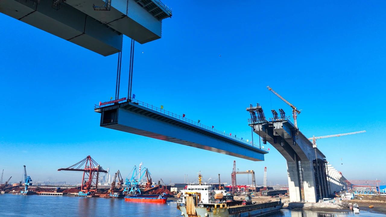 自2022年開始施工以來,項(xiàng)目團(tuán)隊(duì)充分發(fā)揚(yáng)鐵軍精神,在大風(fēng)、高鹽、潮汐、凍融等環(huán)境中完成105米超長灌注樁、4488方大體積承臺、42米超高墩柱、17米高0#塊370噸懸臂澆筑、1200噸鋼梁吊裝等30余項(xiàng)關(guān)鍵節(jié)點(diǎn),推動“世界第一跨”朝通車目標(biāo)穩(wěn)步前進(jìn)。
