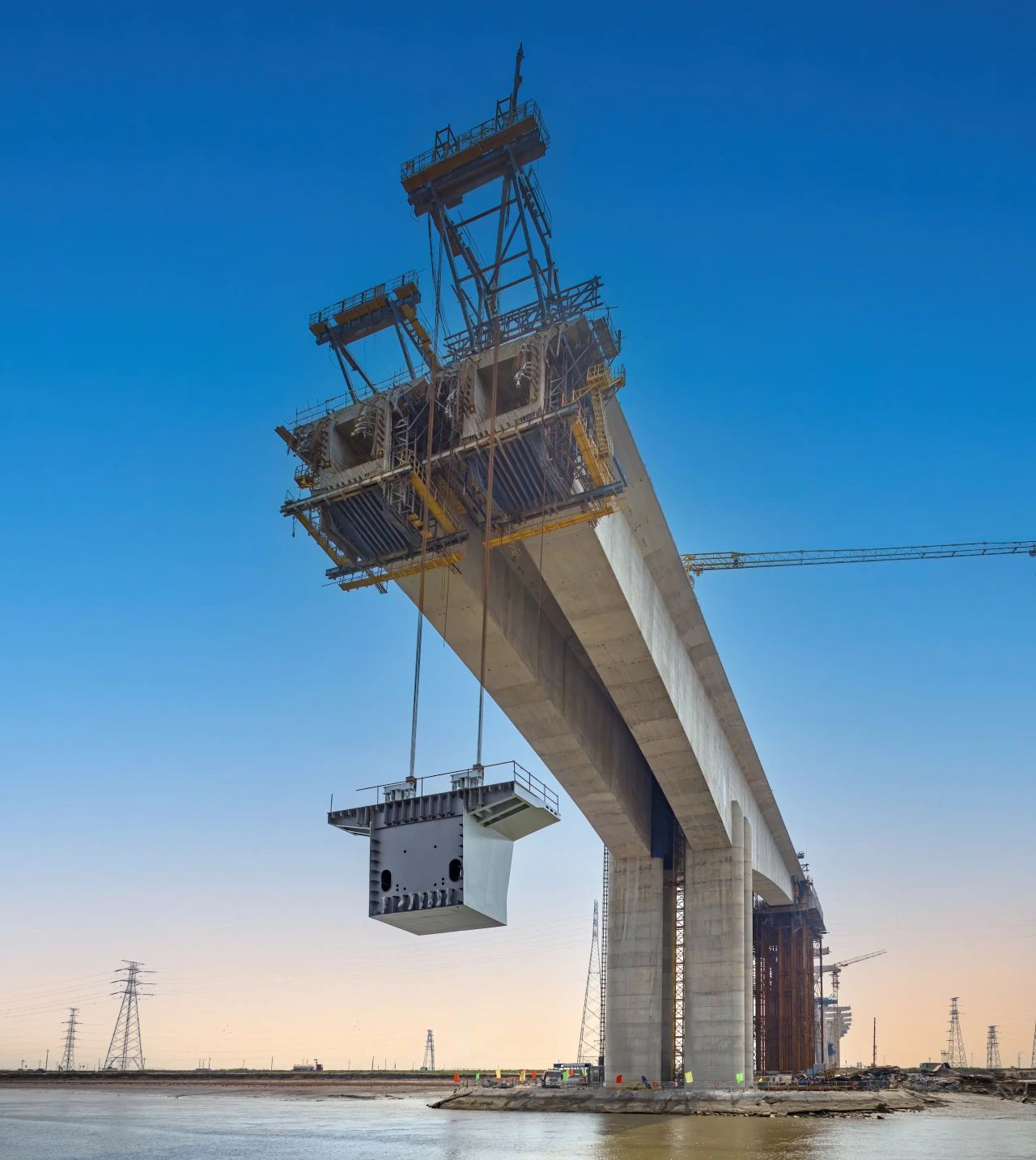 由于項(xiàng)目地處渤海入???,大型浮吊受限于通航寬度無法駛?cè)耄瑸楣?jiān)千噸重鋼梁托舉難題,項(xiàng)目研發(fā)智能吊掛一體機(jī),實(shí)現(xiàn)混凝土懸臂澆筑與鋼梁吊裝的智能化、自動化作業(yè)和施工全過程的智能控制與監(jiān)測,為復(fù)雜大跨橋梁施工帶來了全新解決方案。