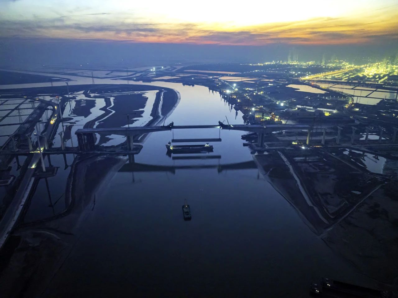 為最大限度降低水流影響,項(xiàng)目團(tuán)隊(duì)監(jiān)測分析潮汐情況,選定潮流流速最小的時(shí)機(jī)果斷出擊,使用萬噸運(yùn)輸船將鋼箱梁運(yùn)送至橋位正下方,通過調(diào)整船舶錨鏈實(shí)現(xiàn)精準(zhǔn)定位。