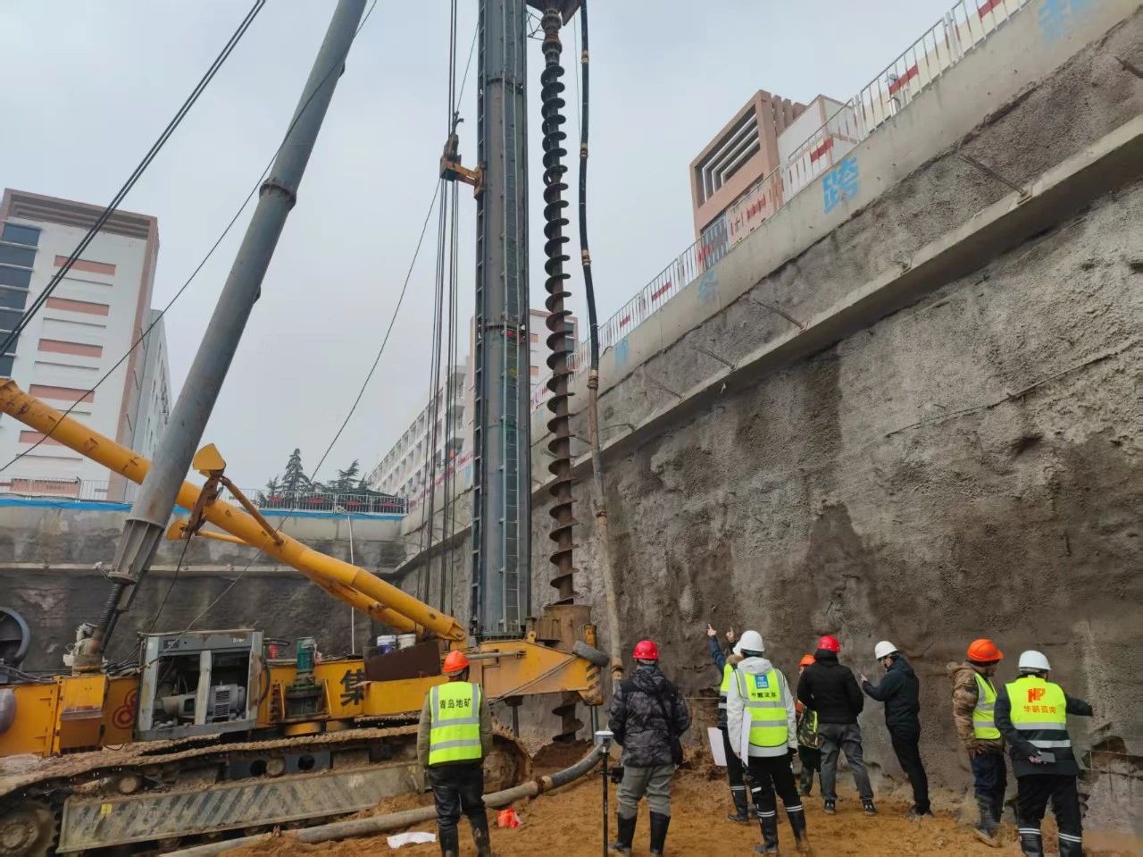 項目地下水情況復雜,工程樁成樁困難,項目組織專家論證及現(xiàn)場水頭壓力試驗,創(chuàng)新性應用嵌巖型長螺旋鉆孔灌注工藝,改良機械與降排水方式,優(yōu)化混凝土配合比,有效降低承壓水對施工的影響。