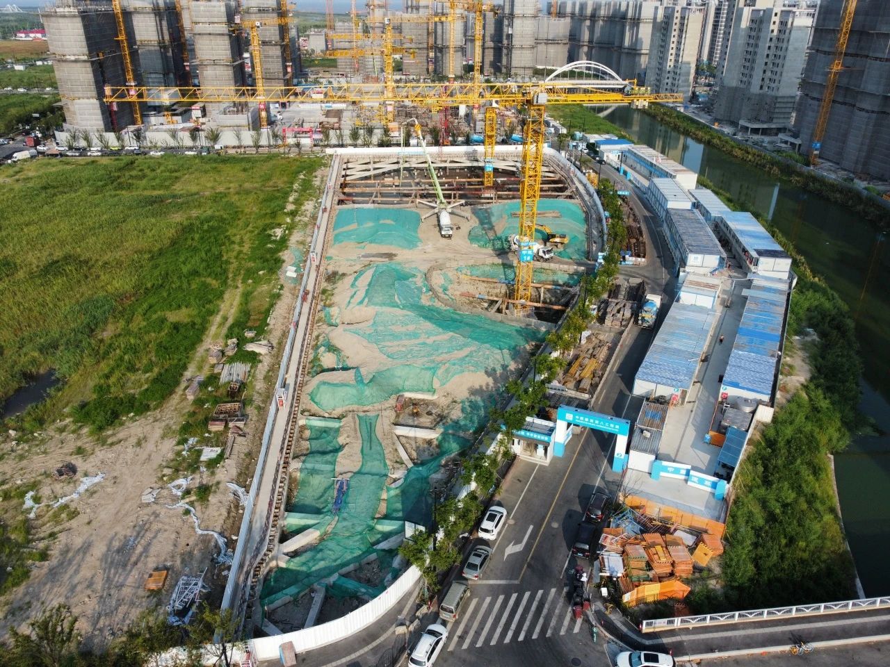 項(xiàng)目應(yīng)用“先撐后拆”施工方法,通過“開挖一段土方、施工一段基礎(chǔ)拆除一段圍護(hù)”的方式,在狹小空間里“靈活作戰(zhàn)”應(yīng)用“鉆孔灌注樁+高壓旋噴樁”減小機(jī)械占用空間,以抬高正負(fù)零標(biāo)高0.5米的方式,使基坑與周邊場(chǎng)地持平,避免雨季內(nèi)澇隱患,保障項(xiàng)目如期封頂。