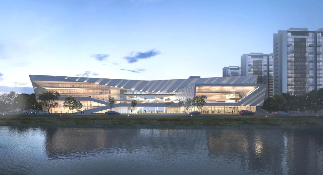 項(xiàng)目以“建筑與人、景觀藝術(shù)、城市對(duì)話”為核心理念,采用大面積轉(zhuǎn)角玻璃幕墻和鋁板墻面,形成復(fù)雜造型與外立面條狀紋理,與濱水景觀相呼應(yīng),打造極具未來感的建筑形態(tài)。