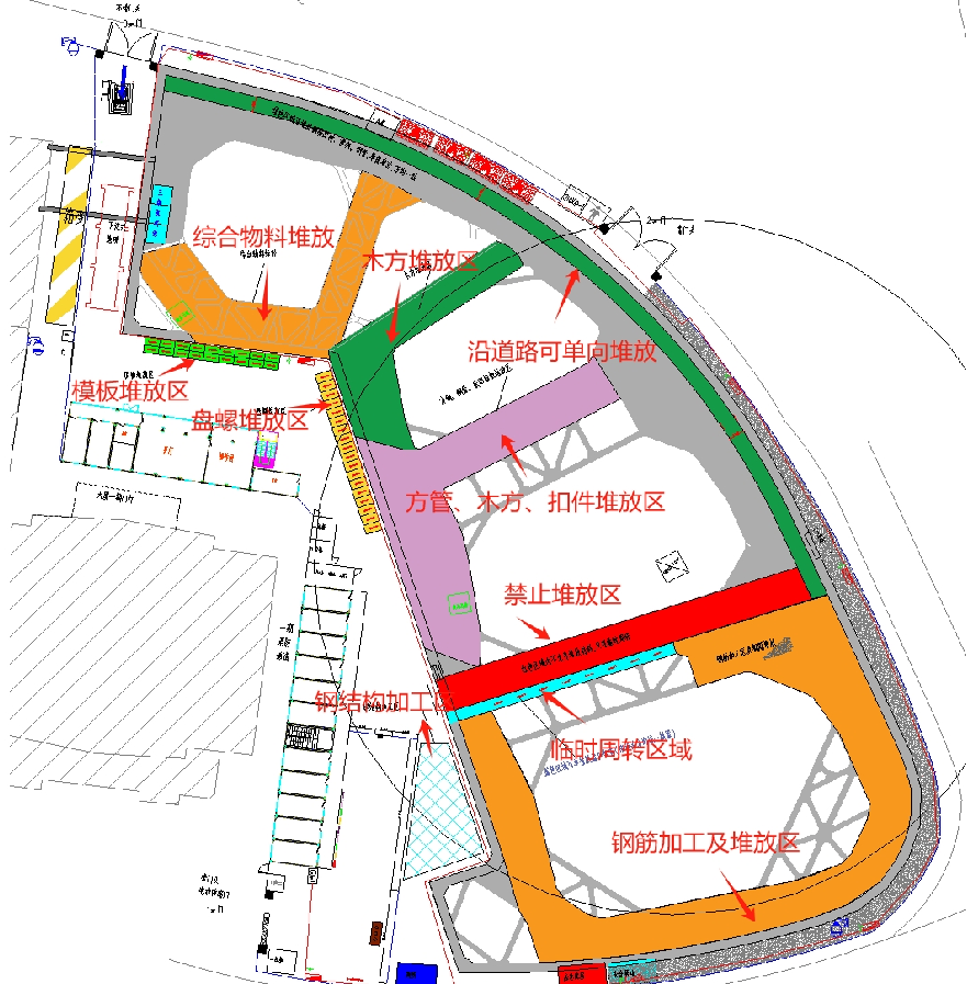 項(xiàng)目基坑面積5500平方米,占項(xiàng)目總場(chǎng)地面積的91%,需要“螺螄殼里做道場(chǎng),方寸之間做騰挪”,項(xiàng)目對(duì)場(chǎng)區(qū)進(jìn)行科學(xué)布置,分類分區(qū)分專業(yè)規(guī)劃材料堆場(chǎng),細(xì)化料場(chǎng)管理責(zé)任單位及責(zé)任人,動(dòng)態(tài)調(diào)整物資進(jìn)場(chǎng)情況,確?!半S用隨進(jìn)、適時(shí)生產(chǎn)”。