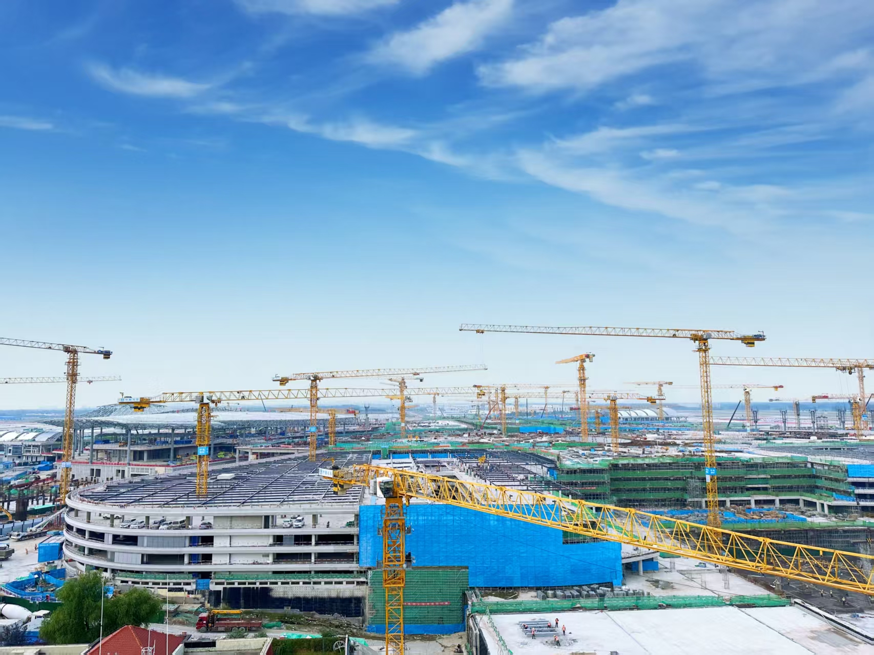 作為聯(lián)合體牽頭單位,一公司整體策劃現(xiàn)場平面布置及工序穿插,梳理施工關(guān)鍵路線,劃分“首開、共構(gòu)、合圍”3大區(qū)域。在不受穿插影響的“首開區(qū)”,項目集中優(yōu)勢資源開展“大流水”施工,高峰期施工人數(shù)超1萬人,并科學(xué)布置場區(qū)內(nèi)24臺塔吊,在滿足機場磁環(huán)境及限飛區(qū)高度限制的同時,實現(xiàn)施工效率最大化。