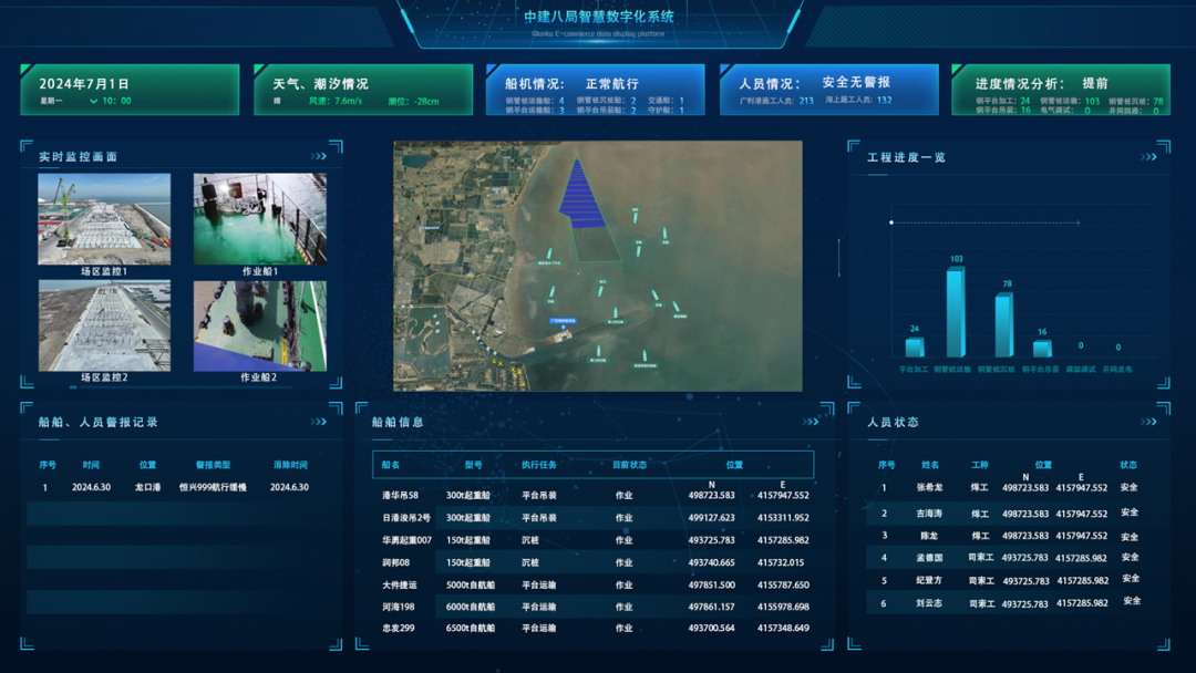 為保障海上施工安全,項(xiàng)目打造海上光伏施工智能監(jiān)管平臺(tái),整合天氣、環(huán)境、人員、船機(jī)、物料等信息,實(shí)現(xiàn)作業(yè)船只航跡監(jiān)控調(diào)度、物料及關(guān)鍵工序進(jìn)度監(jiān)管等功能,達(dá)成管理可視化。同時(shí),項(xiàng)目研發(fā)智能潮位監(jiān)測(cè)系統(tǒng)和智能風(fēng)浪預(yù)測(cè)系統(tǒng),結(jié)合實(shí)時(shí)監(jiān)測(cè)與歷史規(guī)律分析實(shí)現(xiàn)高精度趨勢(shì)預(yù)測(cè),全面應(yīng)用無(wú)人機(jī)和無(wú)人船巡檢,構(gòu)建 “天 - 空 - 海 - 地” 全域施工監(jiān)控。此外,項(xiàng)目還研發(fā)自動(dòng)脫鉤緩降分配吊架以規(guī)避高空解鉤風(fēng)險(xiǎn),為夜間趕潮施工人員配備安全肩燈,守護(hù)作業(yè)安全。