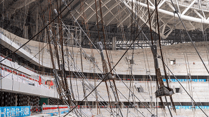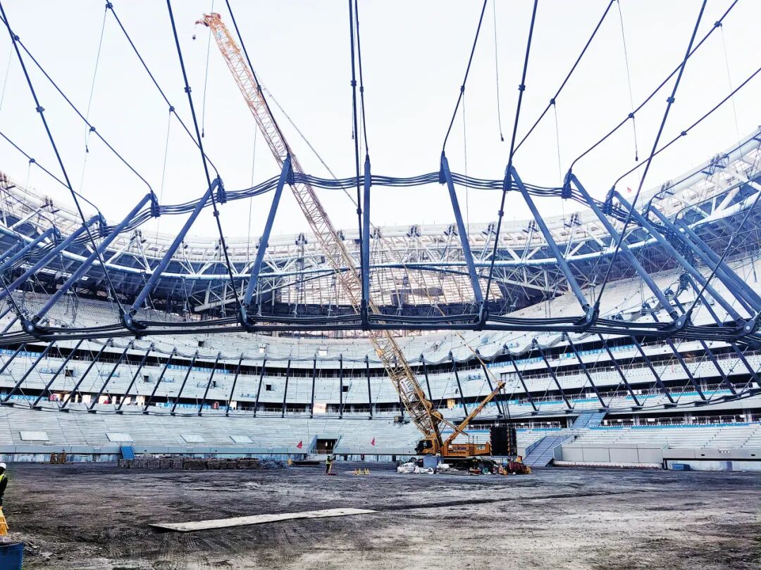 隨著索桁架張拉完成,項(xiàng)目即將進(jìn)入高透光 PTFE 膜安裝階段。目前,足球場(chǎng)室內(nèi)水電、裝修等工作同步開展,看臺(tái)座椅已開始舒適度比選,金屬屋面即將鋪設(shè)面層鋁板,建設(shè)者們正高效推進(jìn)各項(xiàng)建設(shè)任務(wù),力爭(zhēng)這座 “黃河明珠” 早日與公眾見面。