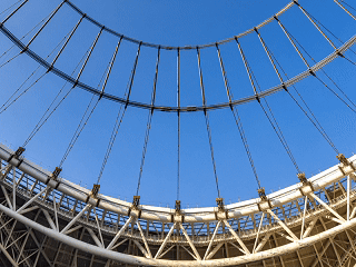 該足球場(chǎng)屋蓋采用國(guó)內(nèi)首個(gè)平面單層膜輪輻式索膜結(jié)構(gòu)體系,這張形似 “巨型自行車輪” 的索桁架是索膜結(jié)構(gòu)體系的支撐骨架,未來將張拉高透光 PTFE 膜,為觀眾提供通透、舒適的觀賽環(huán)境。