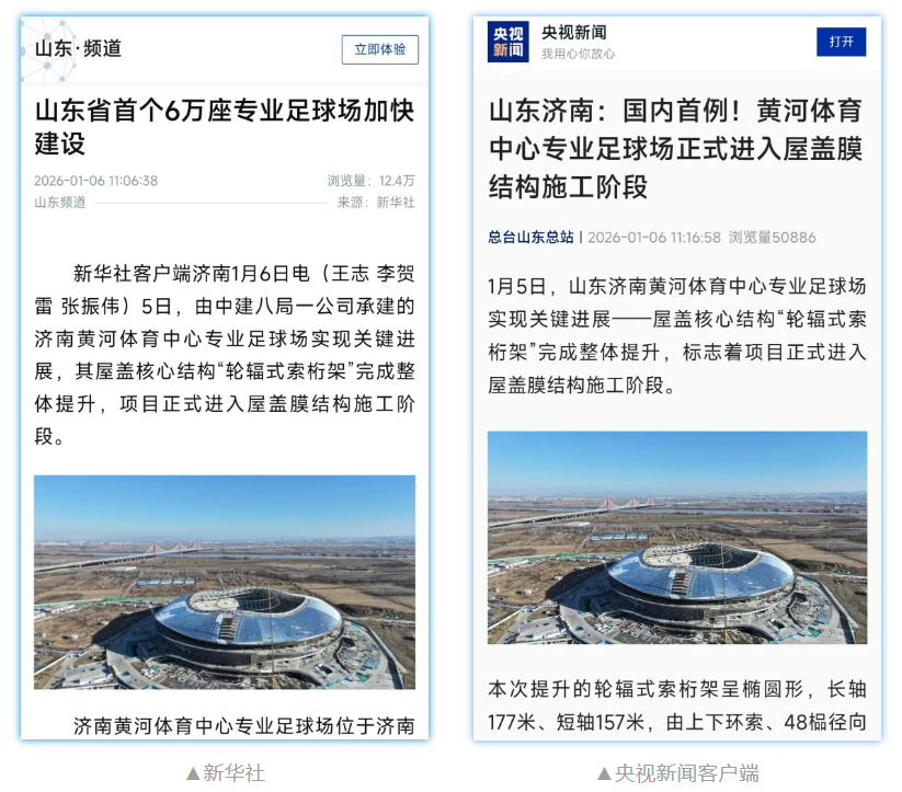 近日,中建八局一公司承建的山東省首個(gè) 6 萬座專業(yè)足球場(chǎng)——黃河體育中心專業(yè)足球場(chǎng)項(xiàng)目完成輪輻式索桁架體系吊裝,正式進(jìn)入屋蓋膜結(jié)構(gòu)施工階段,受到新華社、央視新聞等主流媒體報(bào)道。