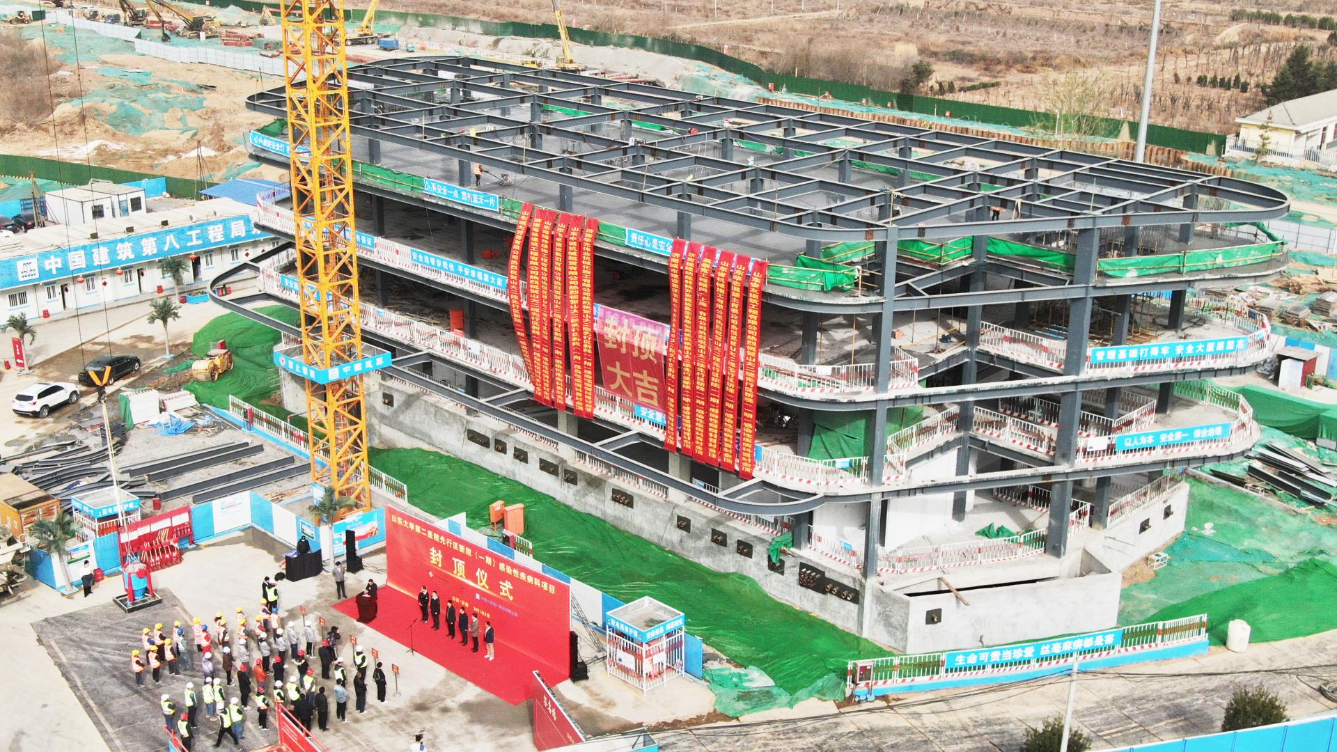 近日,濟南先行區(qū)的首家三甲醫(yī)院——山東大學(xué)第二醫(yī)院北院區(qū)(一期)感染性疾病科項目,奮戰(zhàn)63天,提前9天完成主體結(jié)構(gòu)封頂這一重要節(jié)點目標(biāo)。