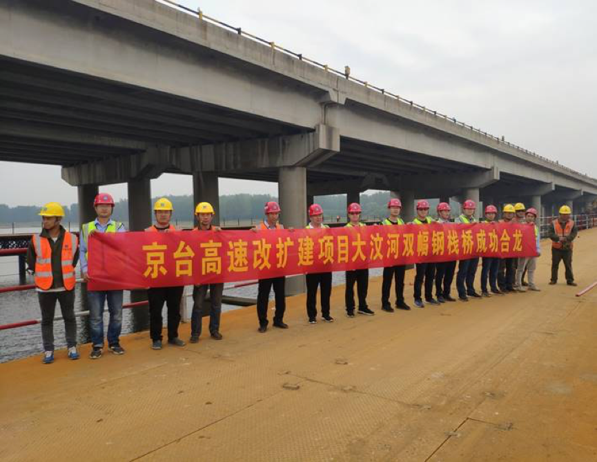 公司京臺(tái)高速項(xiàng)目大汶河特大橋雙幅鋼棧橋順利合龍