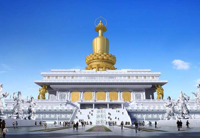 主體建筑雄偉、氣勢恢宏,金世尊安然屹立在城市之巔。從金碧輝煌的舍利金瓶、寓意國泰民安的天王護法,到氣勢如虹的靈光寶殿、吉時升起拋灑甘露的觀音水法,再到暗藏神秘地宮、出土珍奇國寶的千年古塔興隆塔,精美絕倫的現(xiàn)代藝術(shù)創(chuàng)作與莊嚴悠久的歷史積淀相互輝映。