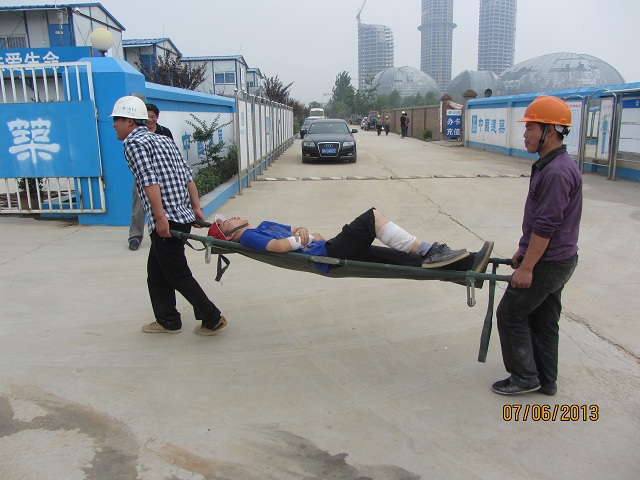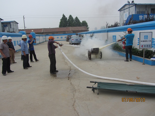 在工人生活區(qū)假設(shè)一個失火點,進(jìn)行現(xiàn)場模擬演練。事先準(zhǔn)備了干粉滅火器、消防水帶、急救箱、擔(dān)架等應(yīng)急救援物資,由義務(wù)消防組組長韓成寶負(fù)責(zé)現(xiàn)場指揮,根據(jù)事先安排,在接到救火命令后,由離失火點最近的工人使用干粉滅火器進(jìn)行初期滅火,待義務(wù)消防小組趕到現(xiàn)場后再用消防水進(jìn)行后期撲救,然后應(yīng)急救援小組模擬救援受傷的工人,進(jìn)行簡單的包扎處理后用擔(dān)架抬離現(xiàn)場。由于分工明確,指揮得到,演習(xí)十分順利。
