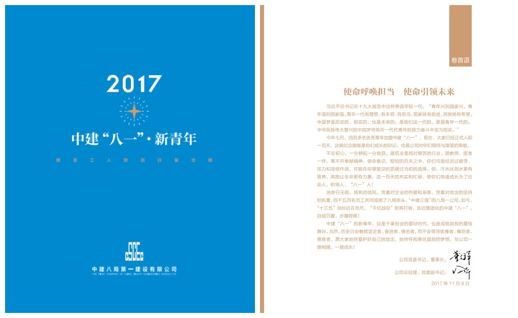 為了讓每位新員工在每一個人生階段都留下成長印記,公司特地制作了《“八一”新青年紀(jì)念畫冊》,收錄了全體2017新員工的個人簡介、成長心得、未來愿景以及導(dǎo)師寄語,并由一公司領(lǐng)導(dǎo)為新員工代表頒發(fā)新青年紀(jì)念畫冊。