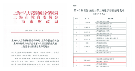 近日,上海市人力資源和社會(huì)保障局、上海市教育委員會(huì)、上海市財(cái)政局聯(lián)合公布第46屆世界技能大賽上海選手培養(yǎng)基地名單,坐落于公司的世界技能大賽中建八局實(shí)訓(xùn)基地(管道與制暖項(xiàng)目)名列其中,被認(rèn)定為第46屆世界技能大賽上海選手培訓(xùn)基地。