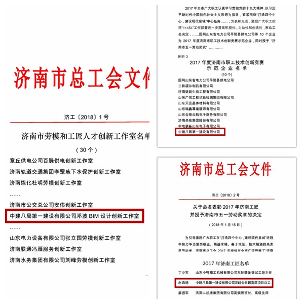 公司榮獲“2017年度濟(jì)南市職工技術(shù)創(chuàng)新競(jìng)賽示范企業(yè)”、“濟(jì)南市五一勞動(dòng)獎(jiǎng)狀”;公司鄧波BIM設(shè)計(jì)創(chuàng)新工作室榮獲“濟(jì)南市勞模和工匠人才創(chuàng)新工作室”榮譽(yù)稱號(hào);公司漢峪商務(wù)中心A5-3#樓及附屬設(shè)施工程項(xiàng)目總工程師趙忠楊榮獲“2017年濟(jì)南工匠”、“濟(jì)南市五一勞動(dòng)獎(jiǎng)?wù)隆睒s譽(yù)稱號(hào)...