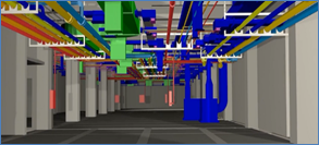 項(xiàng)目地下階段施工時(shí)考慮到機(jī)電預(yù)留預(yù)埋、地鐵聯(lián)絡(luò)線(xiàn)接駁等需要深化的部位,利用BIM模型對(duì)復(fù)雜節(jié)點(diǎn)進(jìn)行放樣和深化,可以指導(dǎo)現(xiàn)場(chǎng)施工。項(xiàng)目在機(jī)電深化過(guò)程中,利用BIM軟件進(jìn)行管線(xiàn)綜合布置和碰撞檢查,并生成碰撞報(bào)告,出具圖紙向業(yè)主設(shè)計(jì)部報(bào)審。