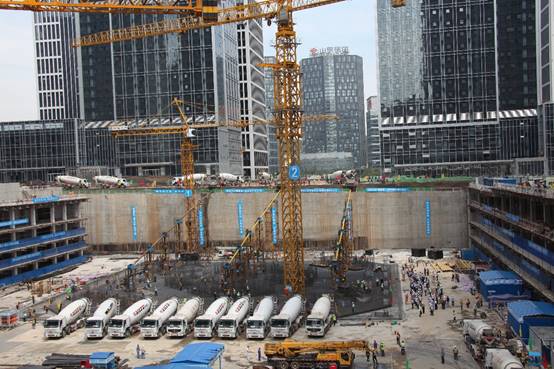 項目自主研發(fā)的免泵送大體積混凝土溜管施工技術(shù)解決了現(xiàn)場狹窄、筏板混凝土澆筑體量大等問題,該技術(shù)實施過程瞬時速度達5分鐘320立方米,創(chuàng)全國第一,平均速度20小時11000立方米,創(chuàng)山東第一。該項技術(shù)獲得山東省優(yōu)秀工法、中建八局QC成果一等獎,經(jīng)鑒定達到了國際先進水平。